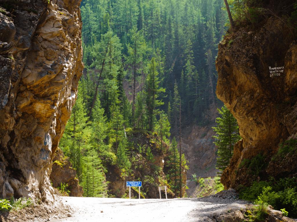Одна из визитных карточек Улаганского района. Красные ворота — природный разлом в скале, через который проходит дорога. Скалы здесь действительно алого цвета, из-за высокого содержания железа, и на солнце они буквально светятся.