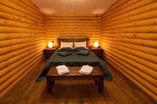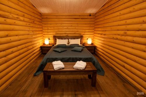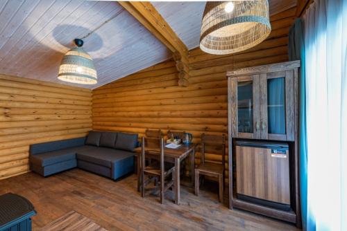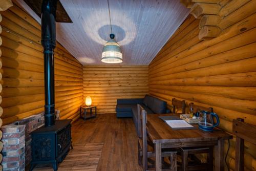 Коттедж-сруб представляет собой двухкомнатный дом с террасой и большими окнами. Внутри оборудована гостиная с камином, установлена необходимая мебель и предусмотрен санузел с душевой. Такой формат подойдёт для семейного проживания или отдыха небольшой компанией.
