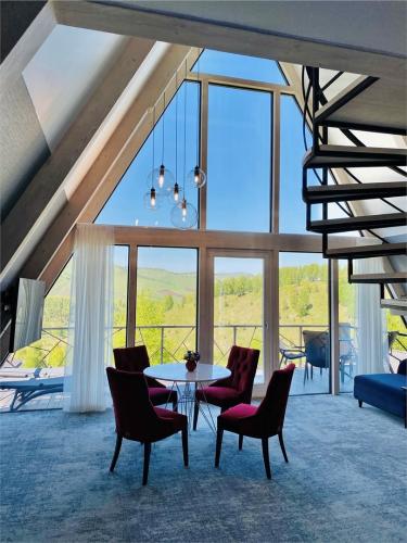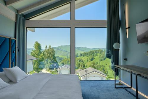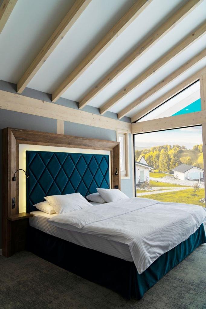 Арт-отель «Altai Palace» расположен в самом центре курорта. Номерной фонд включает 44 классических номера в основном корпусе — от стандартов до сюитов, оснащённых антикварной мебелью. А также комплекс отдельно стоящих шале для любителей уединенного проживания: современные просторные виллы для тех, кто ценит пространство, стильные дома A-frame для семейного отдыха и уютные шале-дуплексы для романтического размещения на двоих. В каждом доме — своя изюминка: панорамные окна открывают невероятные виды на горы. Только представьте: вы отдыхаете на белоснежной кровати, а за окном — завораживающие пейзажи Алтая.