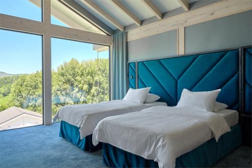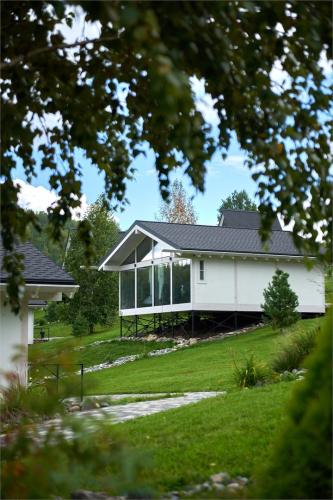 Вокруг отеля раскинулась большая территория курорта: открытые подогреваемые бассейны, банный комплекс с сибирским чаном, прогулочный парк с детскими зонами, корт для падел-тенниса, спортивные площадки, зона костровища, барбекю-зона, каток, центр активных приключений с квадроциклами, парапланами, снегоходами и багги.