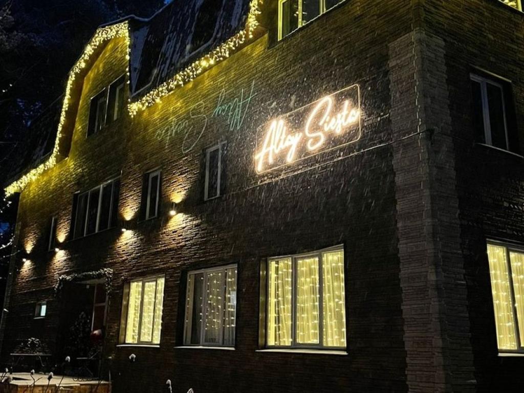 Турбаза занимает просторную территорию площадью около 2 гектаров. Со стороны реки предусмотрен пологий спуск к воде, оборудованный зонами отдыха с мангалами и уютными беседками. Основной жилой фонд представлен трехэтажным корпусом, оформленным снаружи декоративным камнем, а внутри натуральным деревом. Он работает круглый год, что делает «Сиесту» комфортной для отдыха в любое время.