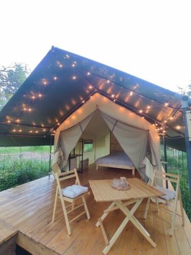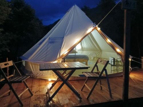 К вашим услугам 5 комфортабельных палаток, шале в лесу, домик на берегу реки, аил, 4 деревяных домика, 2 шатра с удобствами на территории.