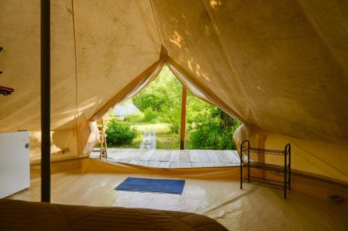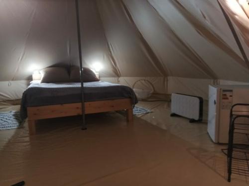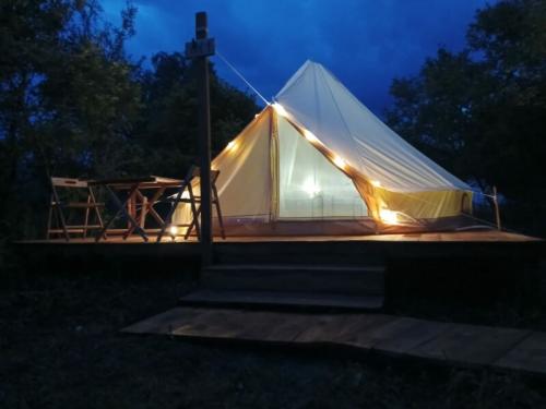 Можно добавить ещё одно место установкой раскладушки с комплектом белья. В каждой палатке есть необходимый набор посуды, мангал, и обогреватель на случай прохладных ночей.