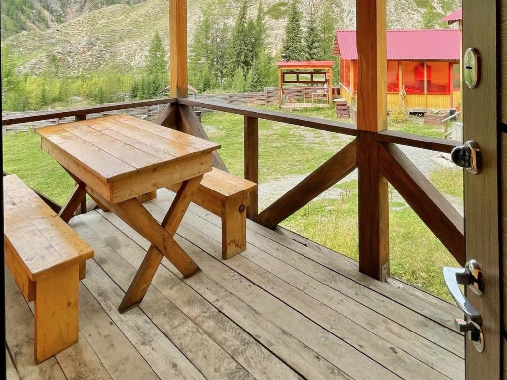 На территории есть просторная беседка-кухня с видом на горные вершины. Здесь установлена газовая плита, микроволновая печь, холодильник, электрический чайник, посуда, а также столы и лавки для трапезы. Для любителей отдыха на свежем воздухе предусмотрена зона барбекю, а прямо на огороде можно набрать свежую зелень к обеду. Гостям также доступна кедровая баня на дровах с парной, комнатой отдыха, верандой и контрастным душем.
