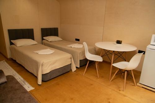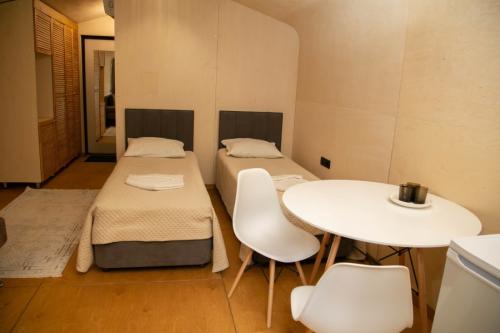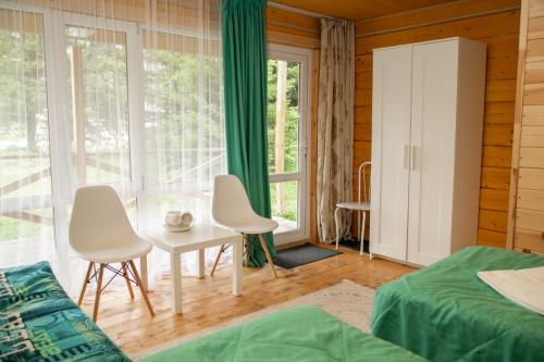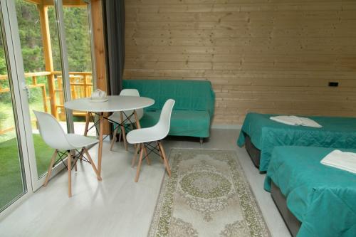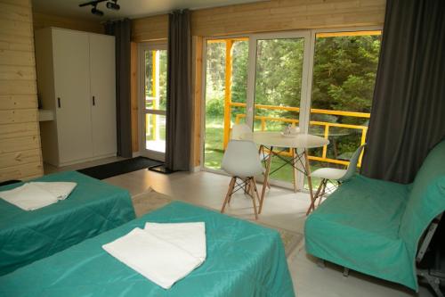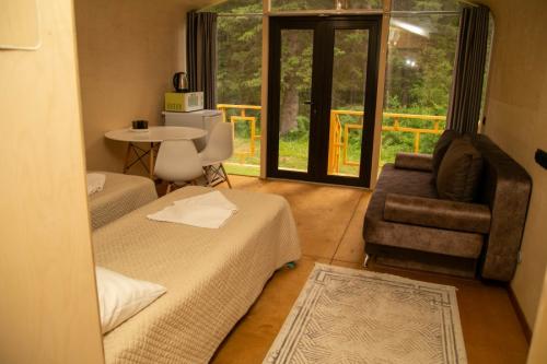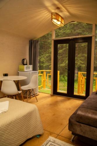 Отель, занимающий территорию в тихом спокойном месте, включает в себя несколько отдельно стоящих корпусов. В распоряжении гостей 4 деревянных домика, 3 модульных дома со стильным дизайном, 3 номера лофт с высокими потолками, домик типа A-Frame, 2-этажный комфортабельный коттедж с террасой, настоящая юрта с печью и аутентичным интерьером, а также бюджетные номера с общим санузлом с гостевом корпусе. Почти во всех вариантах размещения предусмотрен свой санузел с душем, есть необходимая мебель, вентилятор, электрочайник.