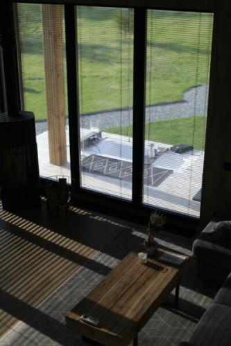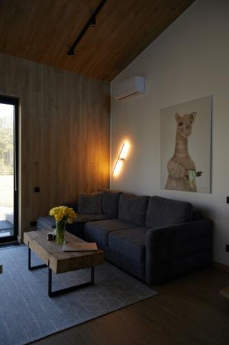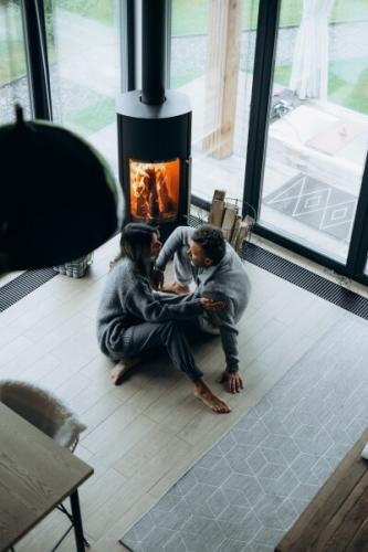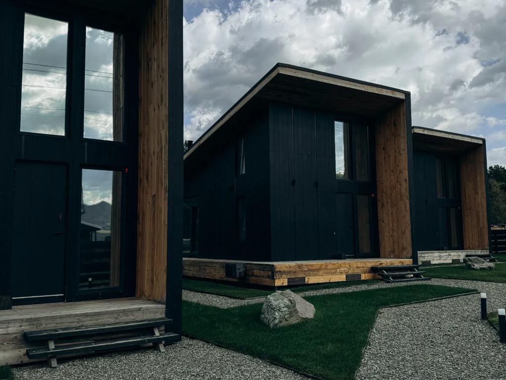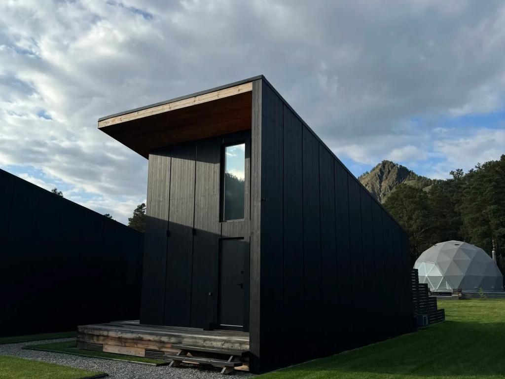 Каждый дом оборудован террасой, костровой площадкой и зоной барбекю. Внутреннее пространство продумано для комфортной жизни: предусмотрены полноценные кухни с техникой и посудой, зоны отдыха и панорамные окна с видом на горы. Центральным элементом интерьера является камин, расположенный у окна, что создаёт спокойную атмосферу для вечернего отдыха.