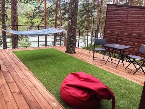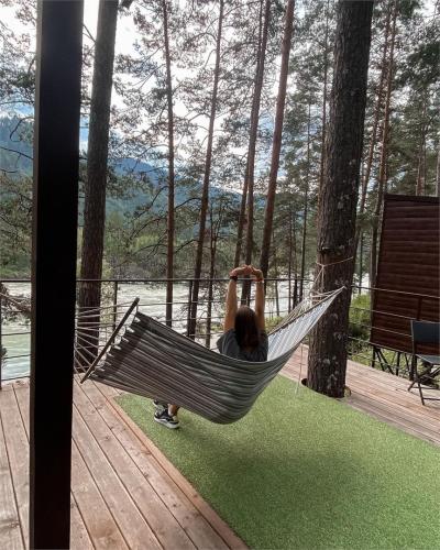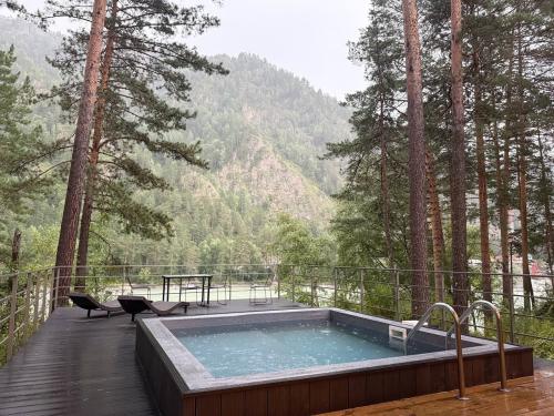 Отель «Царская охота» располагается по обе стороны от р. Катунь в 28 км от курорта Манжерок и в 50 км от аэропорта. На территории отеля — легендарный Красный мост, а за ним — Камышленский водопад. Вокруг 3 га реликтового соснового леса.
