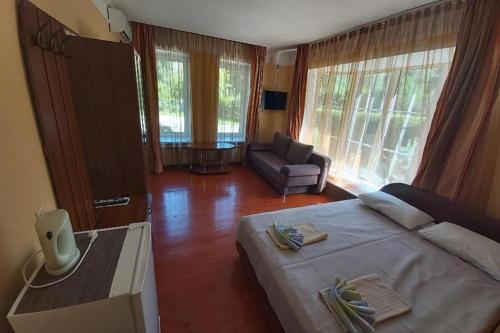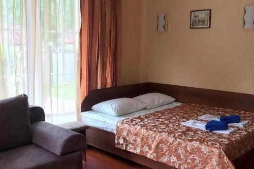 Номер находится на первом этаже.К вашим услугам: двуспальная кровать, диван, сан.узел с душевой кабиной, кондиционер, холодильник, чайник, полотенца.На первом этаже, общая обеденная зона, кухня со всем необходимым оборудованием. На территории отеля, так же расположены мангальные зоны в свободном пользовании.Завтрак в стоимость номера не входит, может быть оплачен при заселении. Стоимость комплексного завтрака - 450 руб./чел.