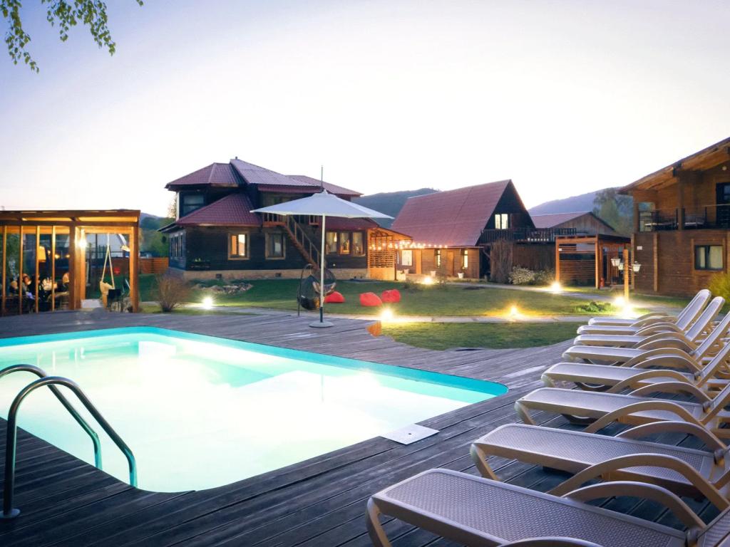 На территории турбазы оборудованы зоны общего пользования и объекты инфраструктуры. Гостям доступен бассейн с подогревом, кафе с террасой, баня на дровах, беседка с камином и костровое место. Для самостоятельного отдыха предусмотрены мангальные зоны. Работают детская и спортивная площадки, установлен батут. Также на базе открыт магазин с товарами алтайского производства.