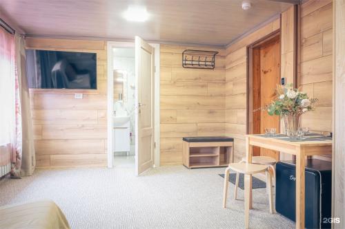 Отдельного внимания заслуживает банный комплекс. Кедровая баня топится березовыми дровами и включает две парные с комнатами отдыха. Каждая парная рассчитана на размещение до шести человек, что делает формат удобным как для семей, так и для небольших компаний.