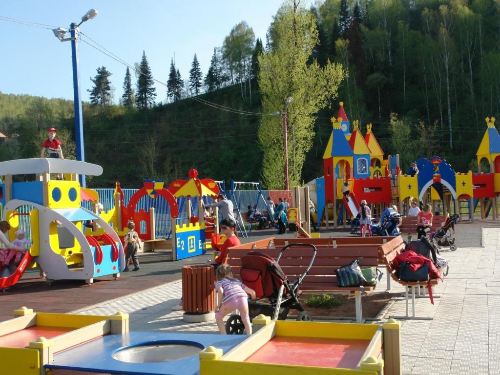 На площадке имеются разнообразные качели, карусели, игрушечный замок с лестницами и горками.