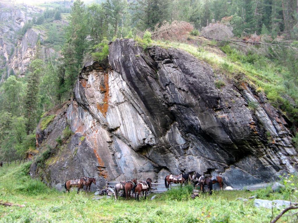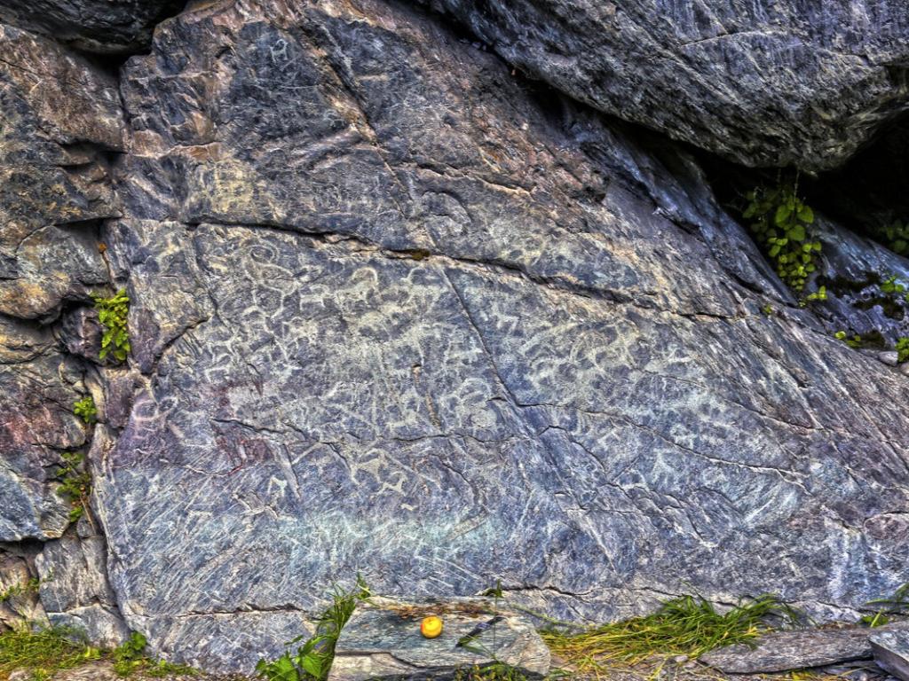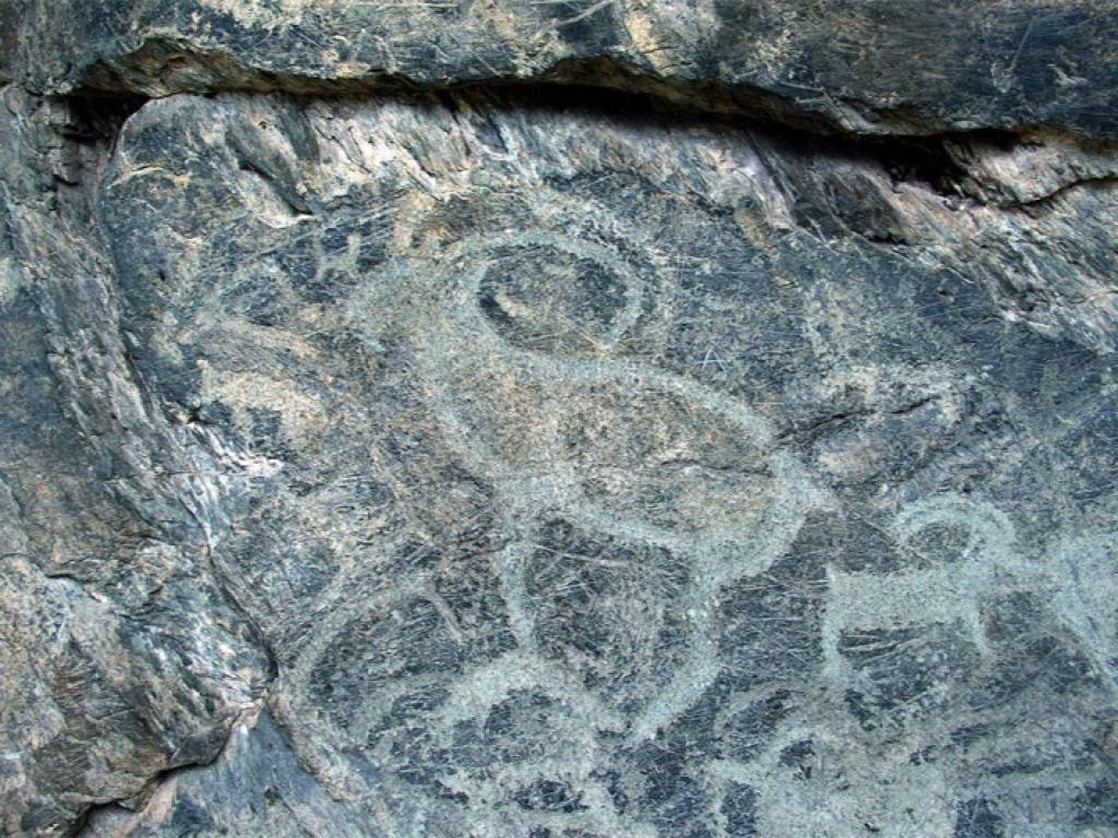 Здесь более сотни петроглифов и из них всего 11 — это антропоморфные рисунки. В основном же здесь изображены животные: охота была для древних людей важной частью жизни, так что ритуалы, проводившиеся здесь, видимо были направлены на дарование свыше охотничьей удачи. Люди же, изображенные здесь, это камлающие шаманы. А некоторые и вовсе не люди, а, с большой вероятностью, духи-покровители или потусторонние хозяева изображенных здесь зверей.