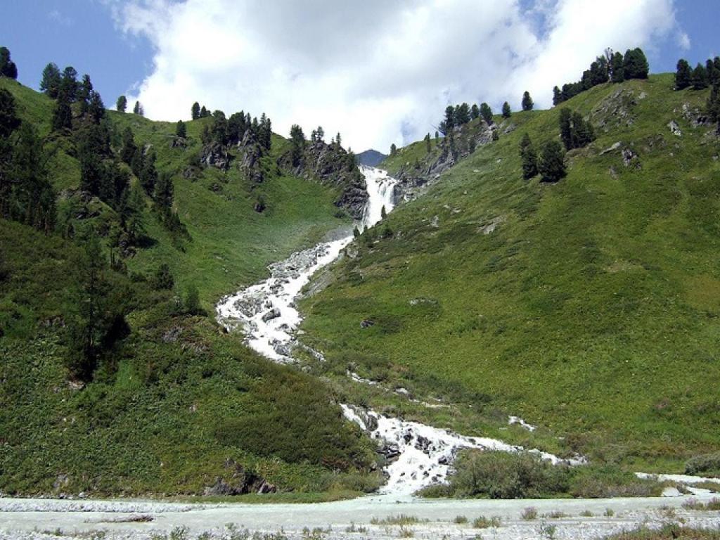 Этот огромный, шумный водопад действительно рассыпается сначала на две струи, а после на тысячи брызг, и выглядит роскошно и величественно. Добраться до него непросто, нужно подниматься вверх к истокам Катуни.
