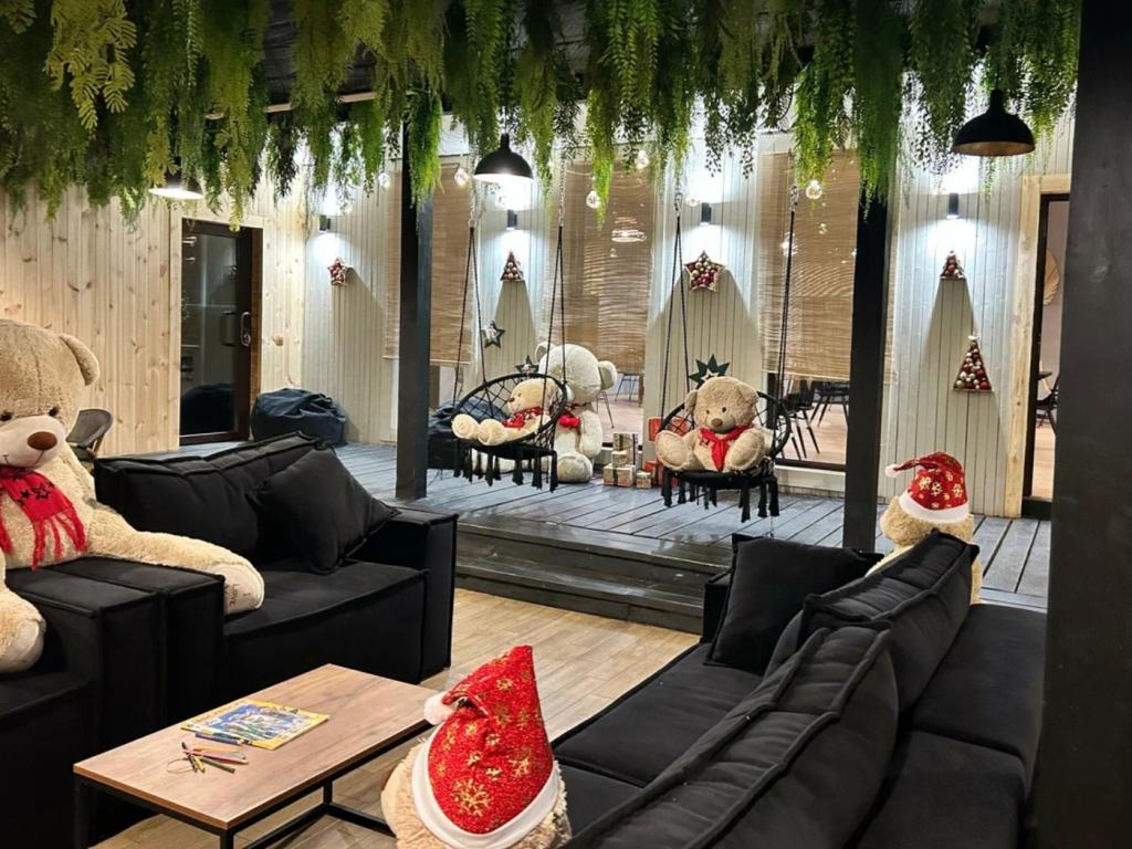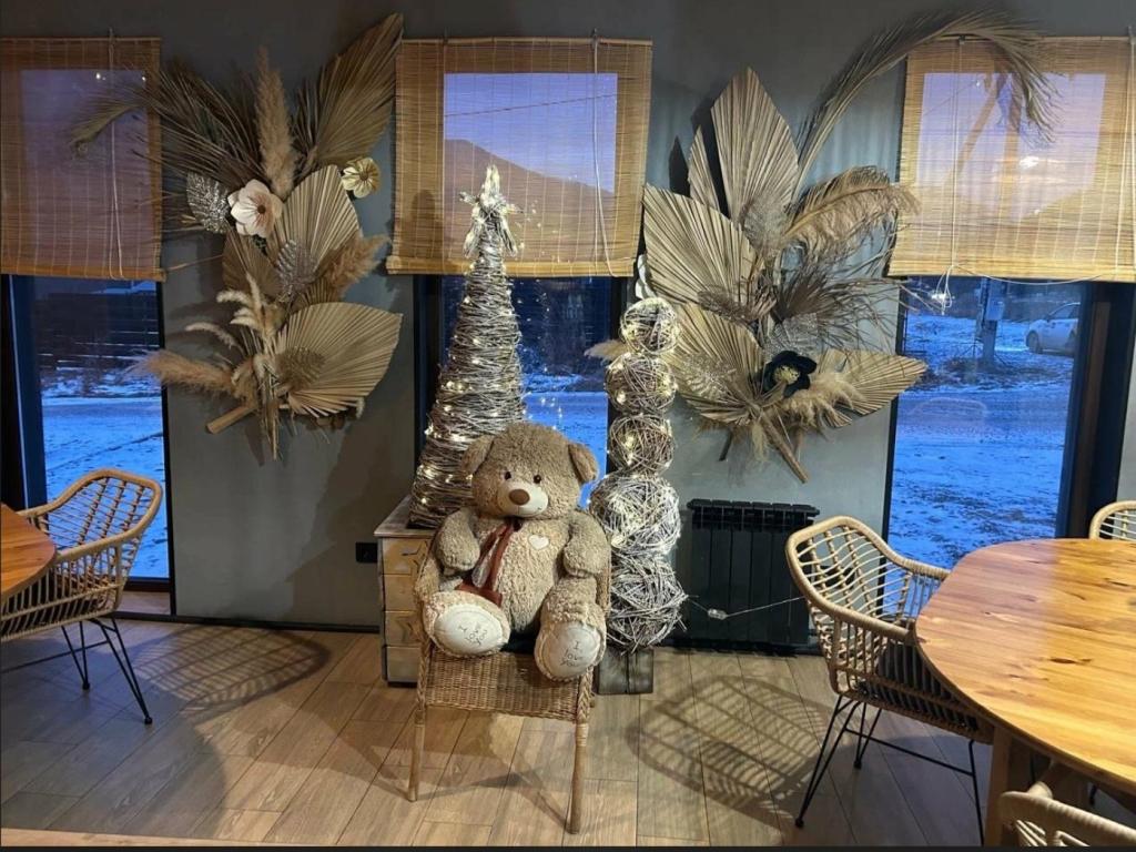 Современный, уютный интерьер ресторана спроектирован на 40 посадочных мест площадью 100 квадратных метров. Витражные окна с видами на горную реку "Катунь" обеспечивают максимальную атмосферность в любое время суток и в не зависимости от времени года.