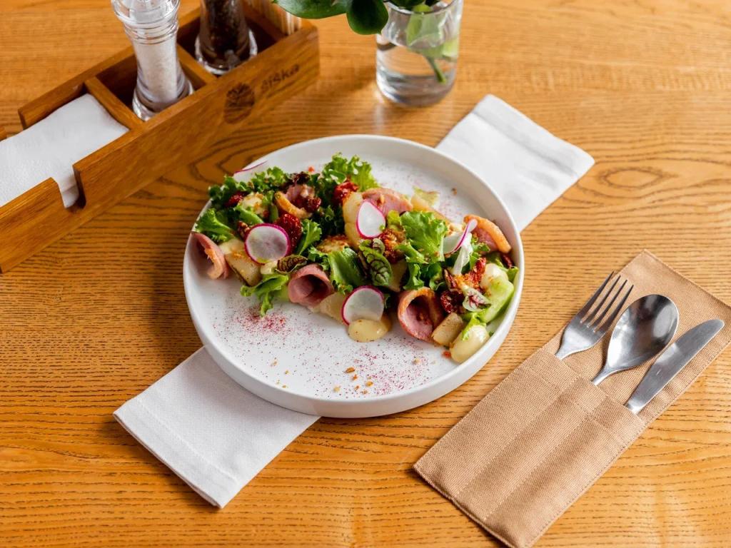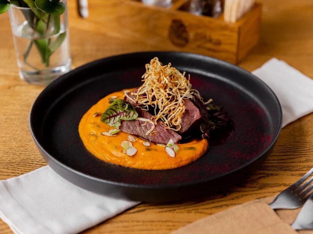 Эффектная авторская подача с элементами молекулярной кухни и нестандартные вкусовые сочетания легли в основу при составлении меню ресторана. В приготовлении блюд используются преимущественно локальные продукты Горного Алтая, такие как алтайская говядина, оленина, утка, грибы, местные сыры, высокогорный мед.