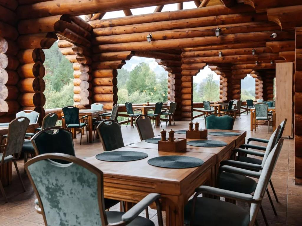 Здесь Вы сможете насладиться тёплой атмосферой ресторана, отведать традиционные алтайские блюда: маралятину, баранину, хариуса, таймень, колбу. А также попробовать минеральную воду из источника, расположенного прямо на территории курорта, алтайский натуральный мёд с нашей собственной пасеки и несколько видов травяного чая.
