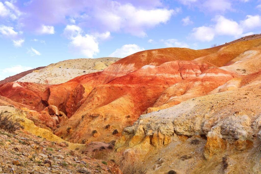 Утром отправляемся «на Марс» — в урочище Кызыл-Чин. Здесь полосатые горы подставляют разноцветные бока лучам солнца, создавая инопланетный ландшафт.