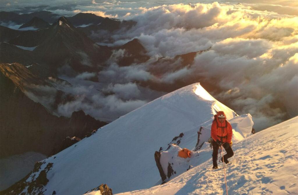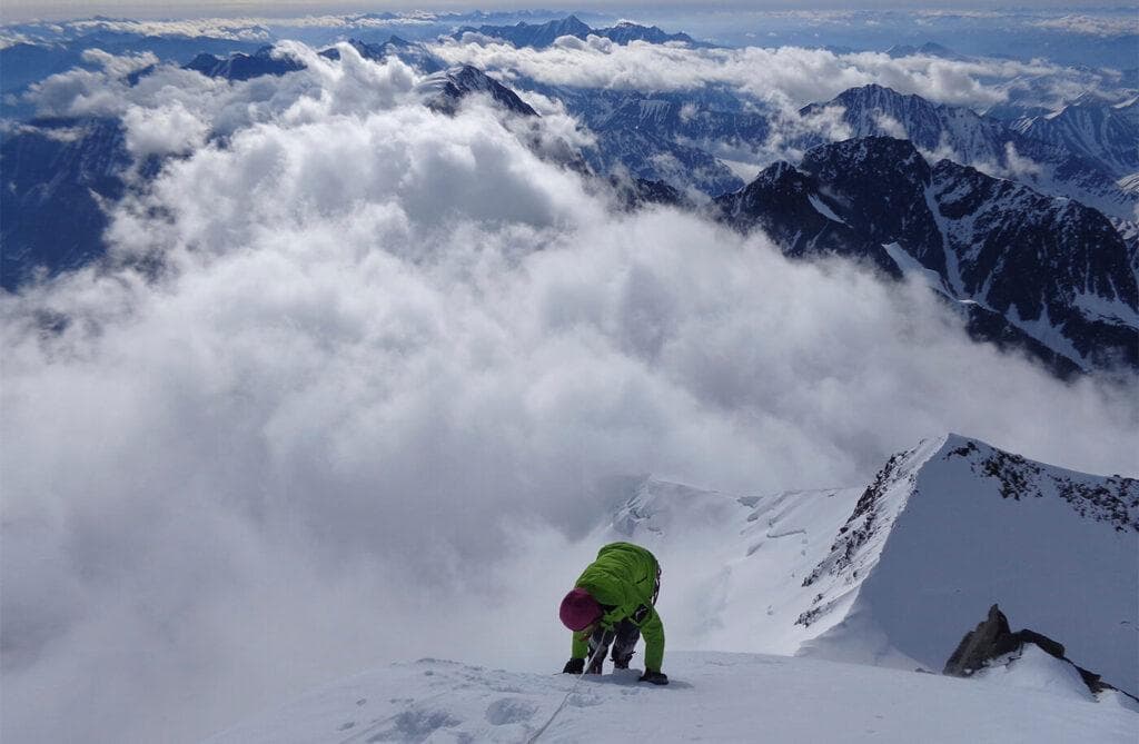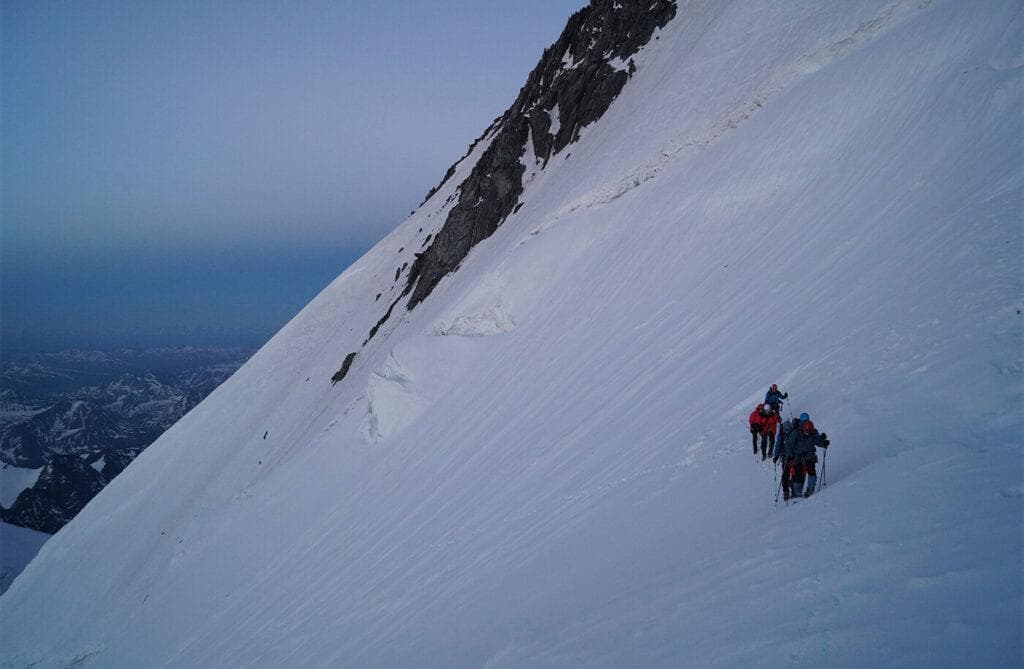 Переход «Томские ночевки» (3000 м) – перевал Делоне (3500 м) – штурмовой лагерь под вершиной Делоне (4100 м). Рано утром выходим к перевалу Делоне, проходим его с помощью перил – специально провешаных веревок. Перепад высот между Томскими стоянками и высшей точкой перевала – 500 метров. После подъема на перевал нам еще предстоит восхождение по снежно-ледовому гребню с участками лазанья по скале в кошках. Маршрут восхождения имеет 4А категорию трудности и проходит по заранее провешаным (на сложных участках) перильным веревкам с использованием альпинистского снаряжения. Под пиком Делоне на отметке 4100 м останавливаемся на ночевку в штурмовом лагере, чтобы набраться сил перед штурмом Белухи.
