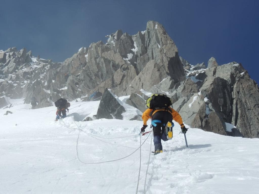 После обеда акклиматизационный выход на гребень вершины Делоне. Отработка техники передвижения в кошках по различным